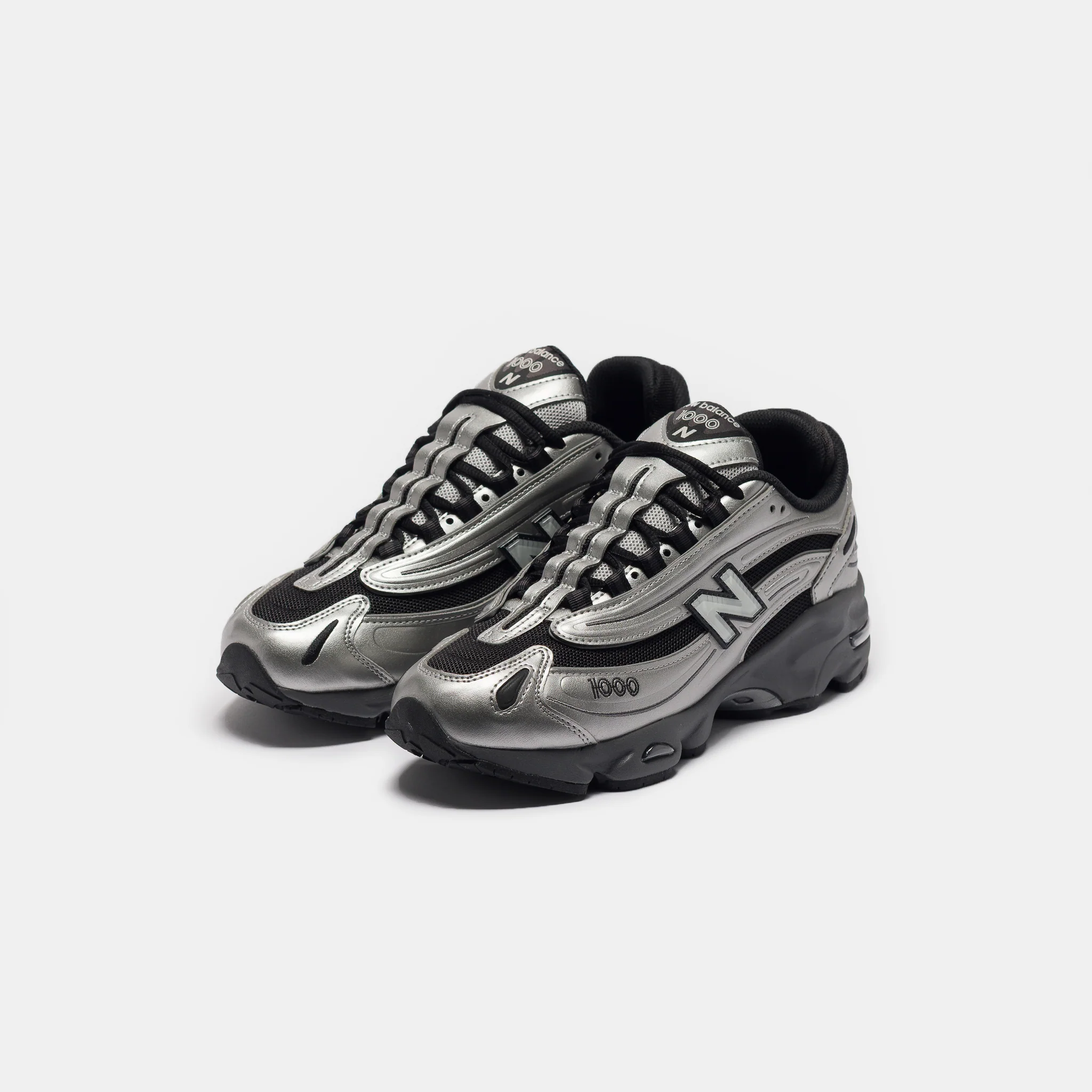 New Balance men's standard fit 1000 sneaker in silver metallic and green. Featuring a black mesh base with metallic silver synthetic overlays, "1000" embroidered on the lateral forefoot, and ABZORB cushioning.