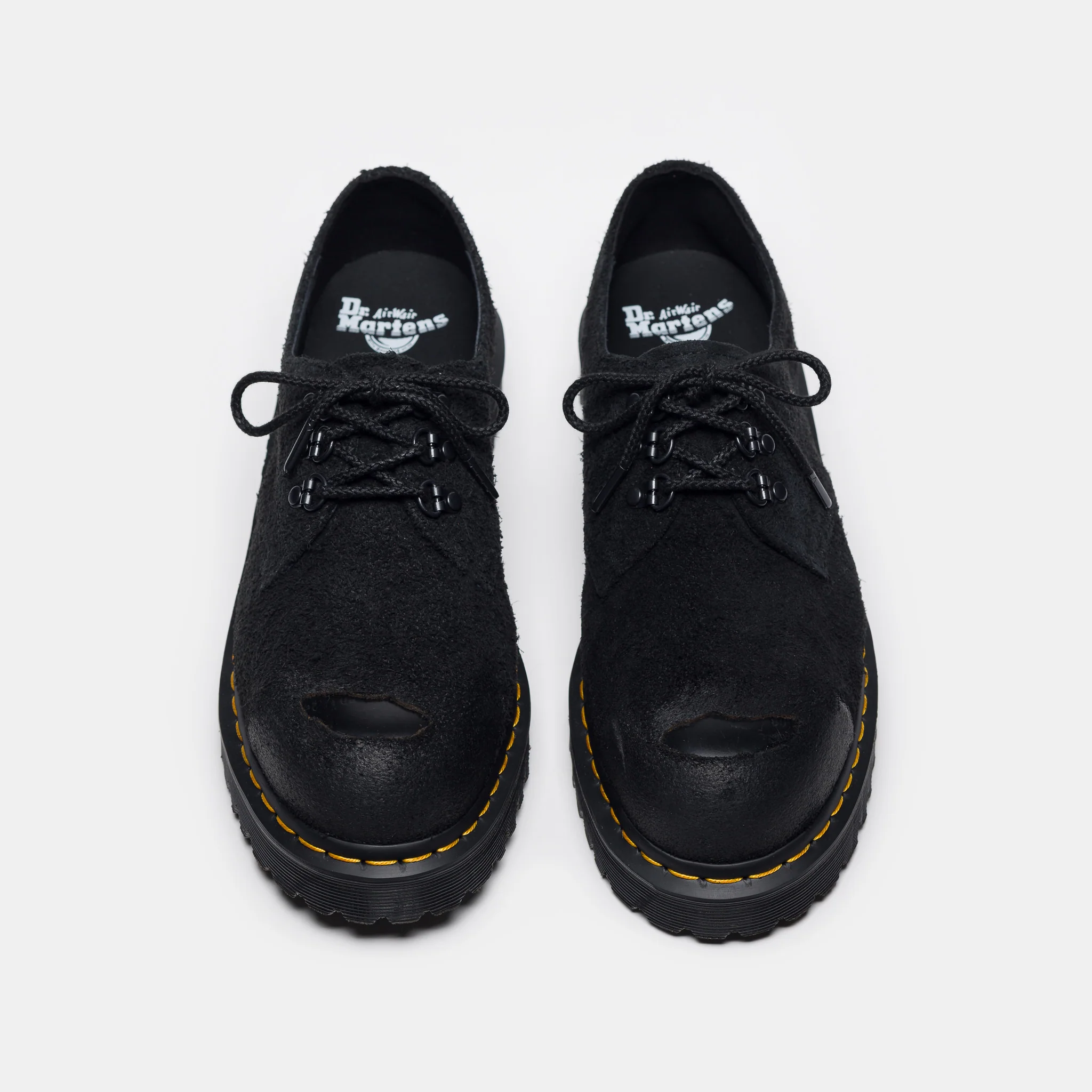 Dr. Martens unisex 1461 Burnished Hairy Suede Steel Toe shoe in Black. Features durable burnished black suede, round toe, and Goodyear welt.
