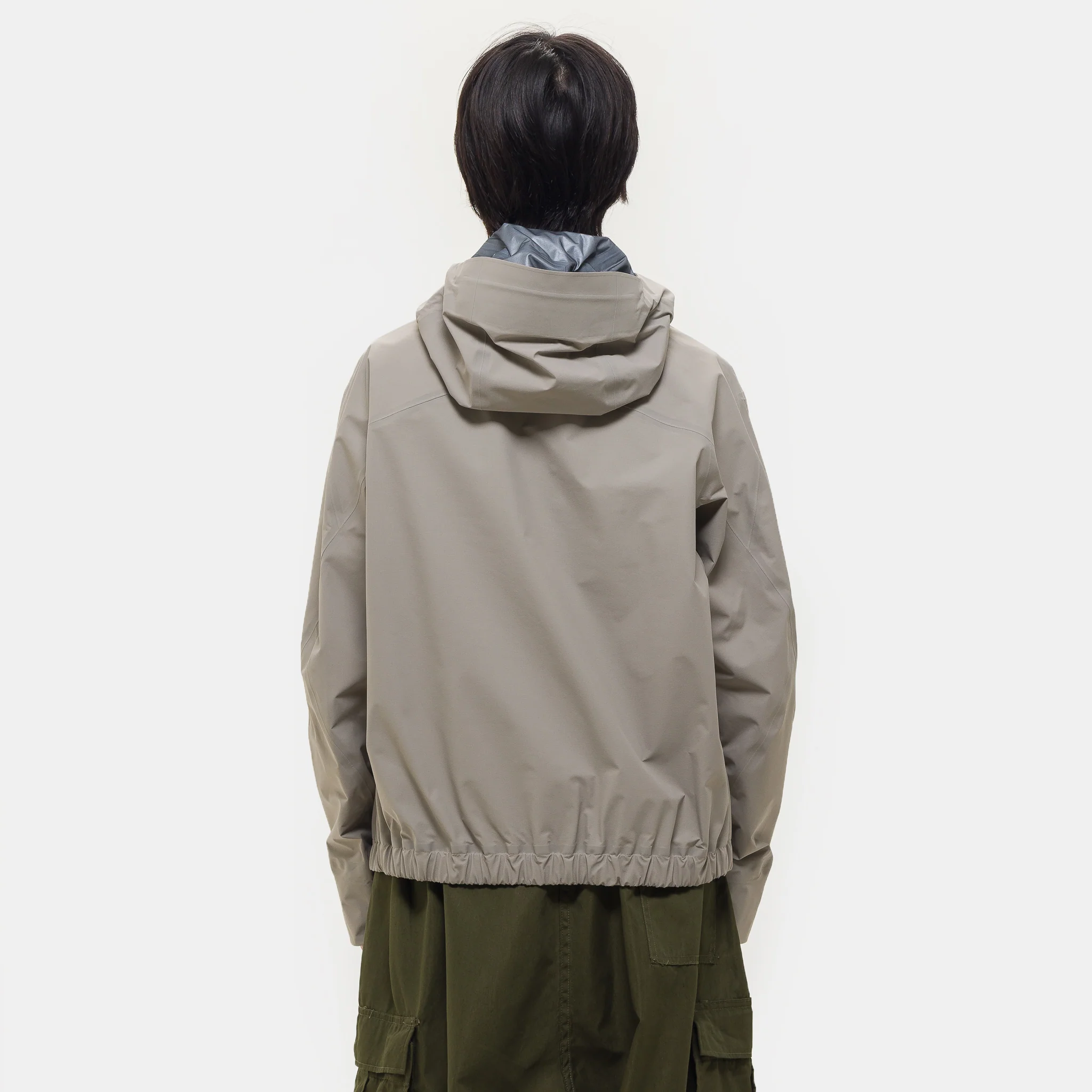 Arc'teryx Veilance jacket in "Rune" stone. Features regular fit, breathable Gore C-Knit, and laminated elastic hem.