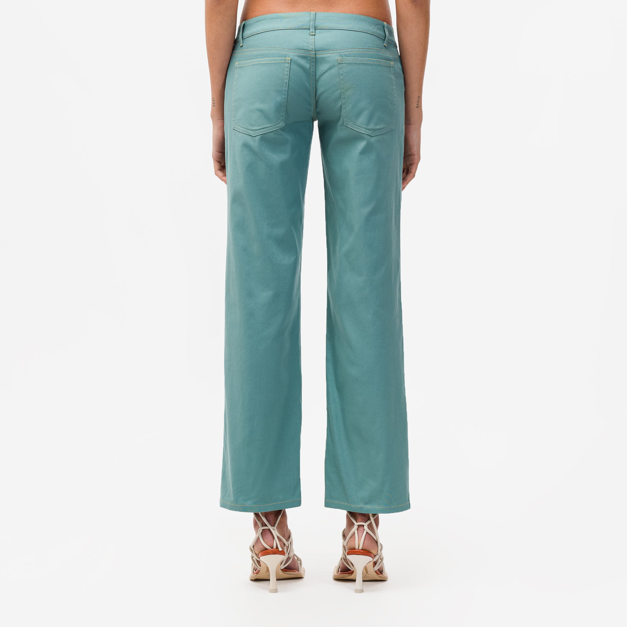 Miaou women’s low rise, straight fit “Slate” blue stretch cotton five-pocket pant. Features a button front waist and a YKK locking zipper fly.