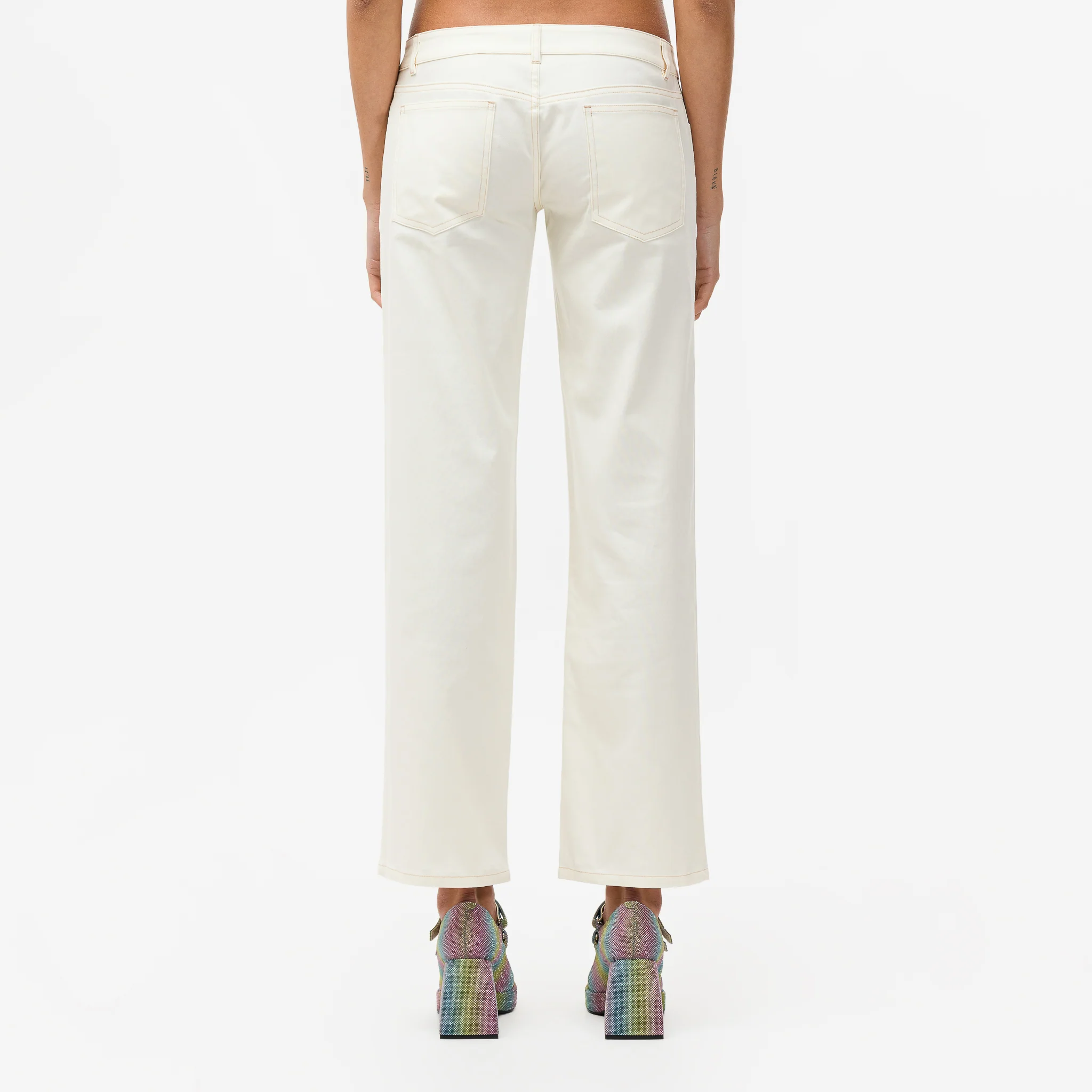 Miaou women’s low rise, straight fit “Creme” white stretch cotton five-pocket pant. Features a button front waist and a YKK locking zipper fly.