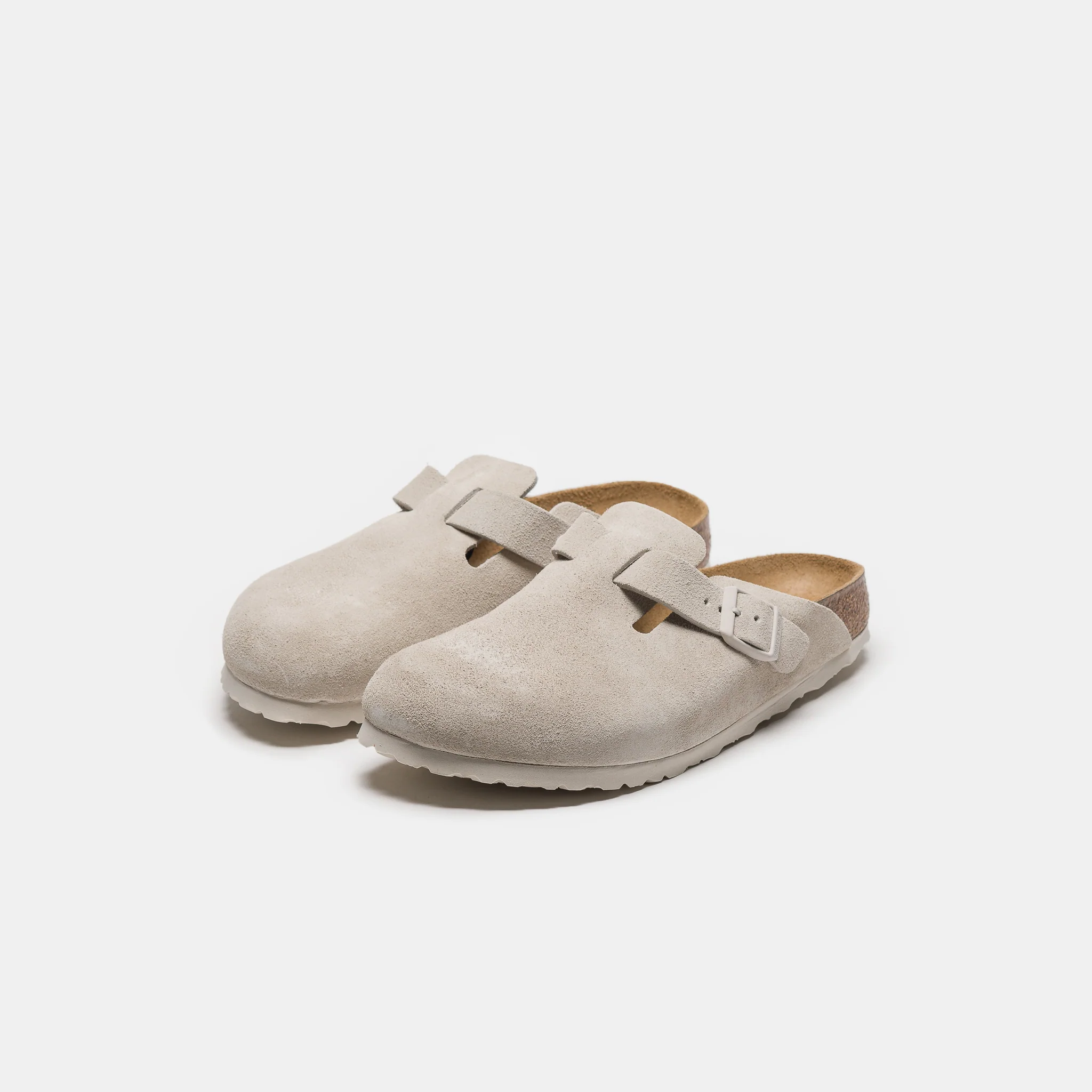 Birkenstock unisex standard fit “Antique” white premium suede mule. Features 2.8 to 3.2 mm leather, adjustable metal pin buckles, an additional soft foam layer on the anatomically shaped cork footbed which offers extra support and all-day comfort, and an EVA outsole.