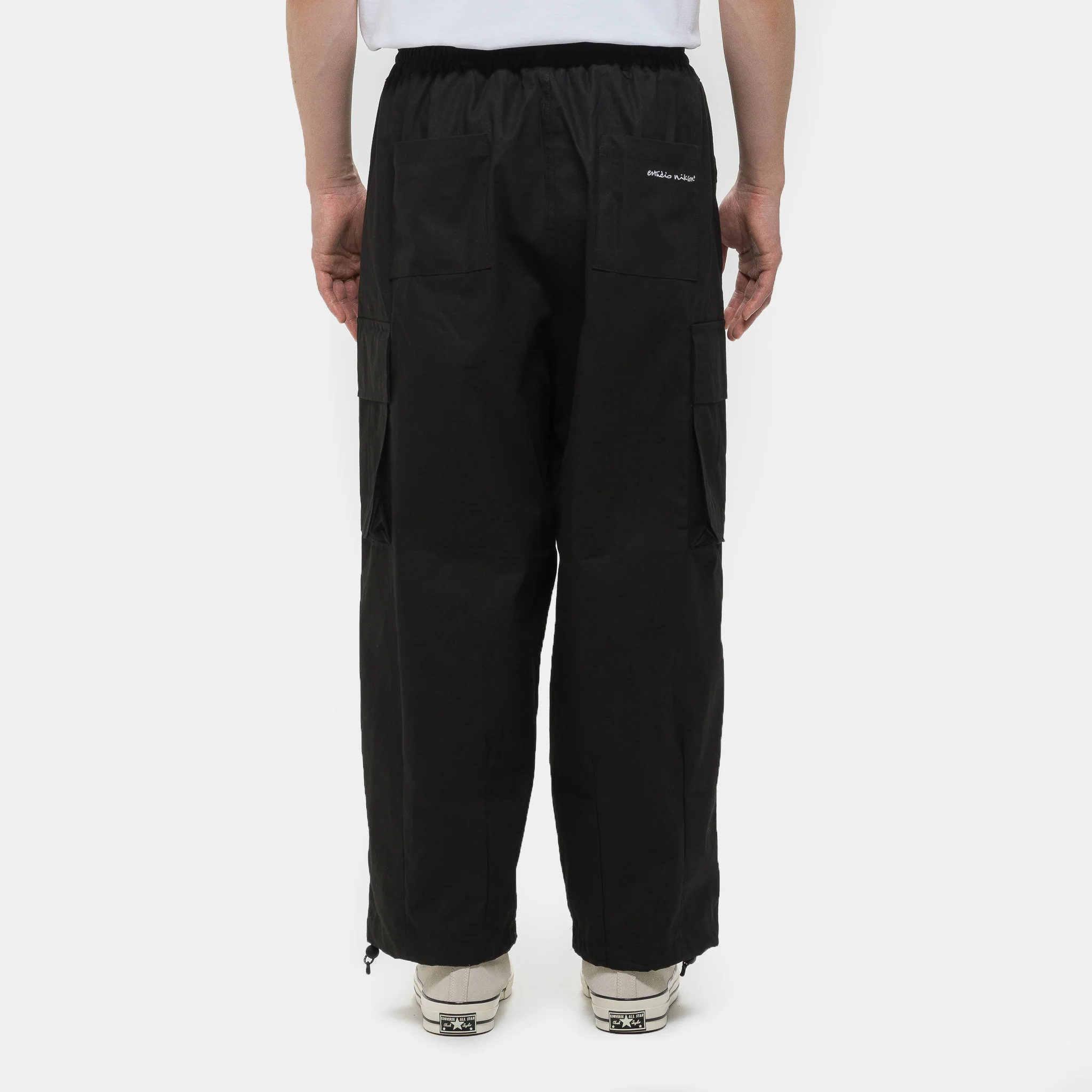 Estudio Niksen's men's stopper balloon cargo trouser in black. Featuring a wide fit, pleat details at front, and elastic band at waist.