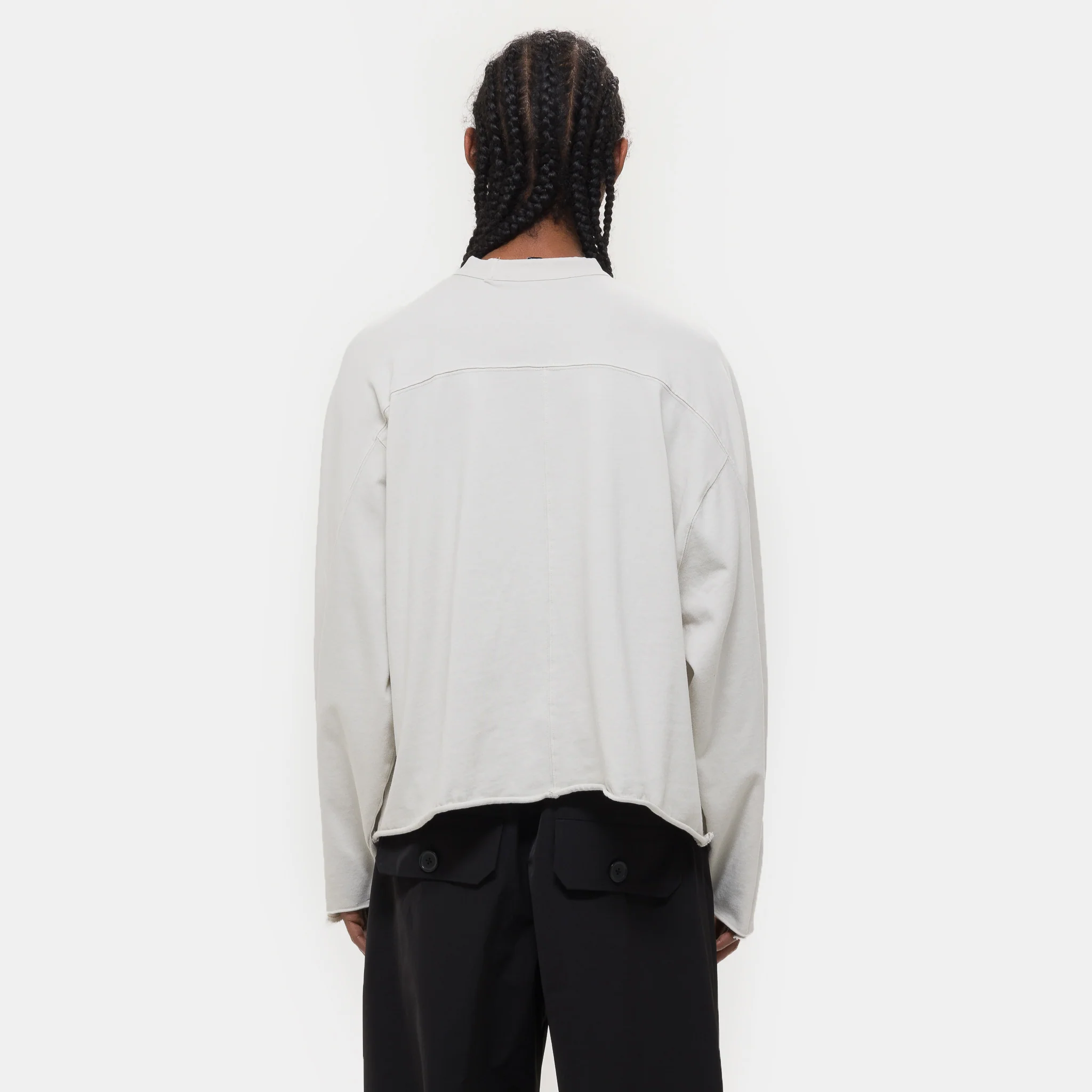 Entire Studios unisex relaxed fit organic cotton long sleeve t-shirt in "rice" white. Features a raglan sleeve, slight mock neck collar, and a boxy fit.