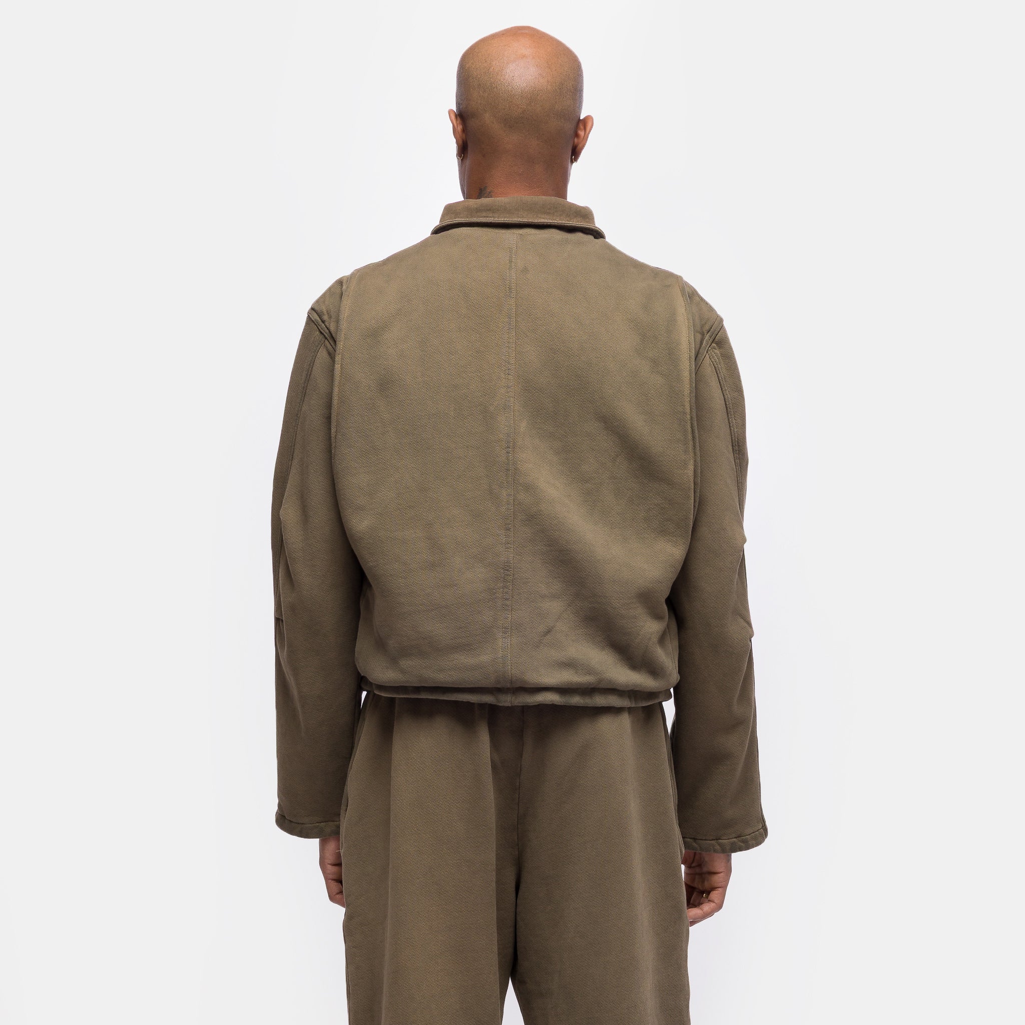 Les Tien heavyweight utility jacket in olive. Features garment dyed finish, ribbed cuffs, and Riri zip.