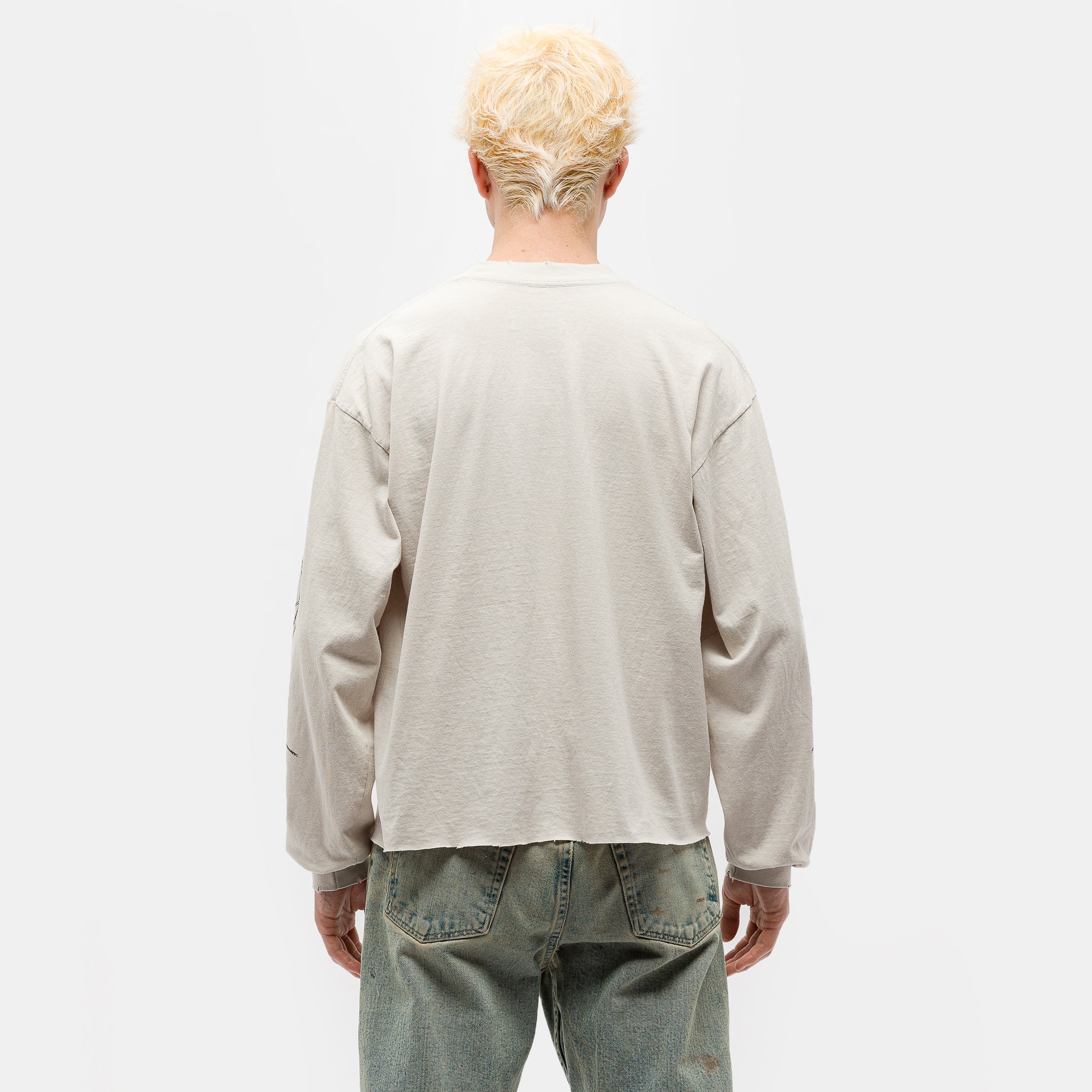 Todo Pasa men's standard fit cement long sleeve t-shirt. Features distressing detail on collar and sleeve cuffs, with printed graphic detailing on torso and sleeves