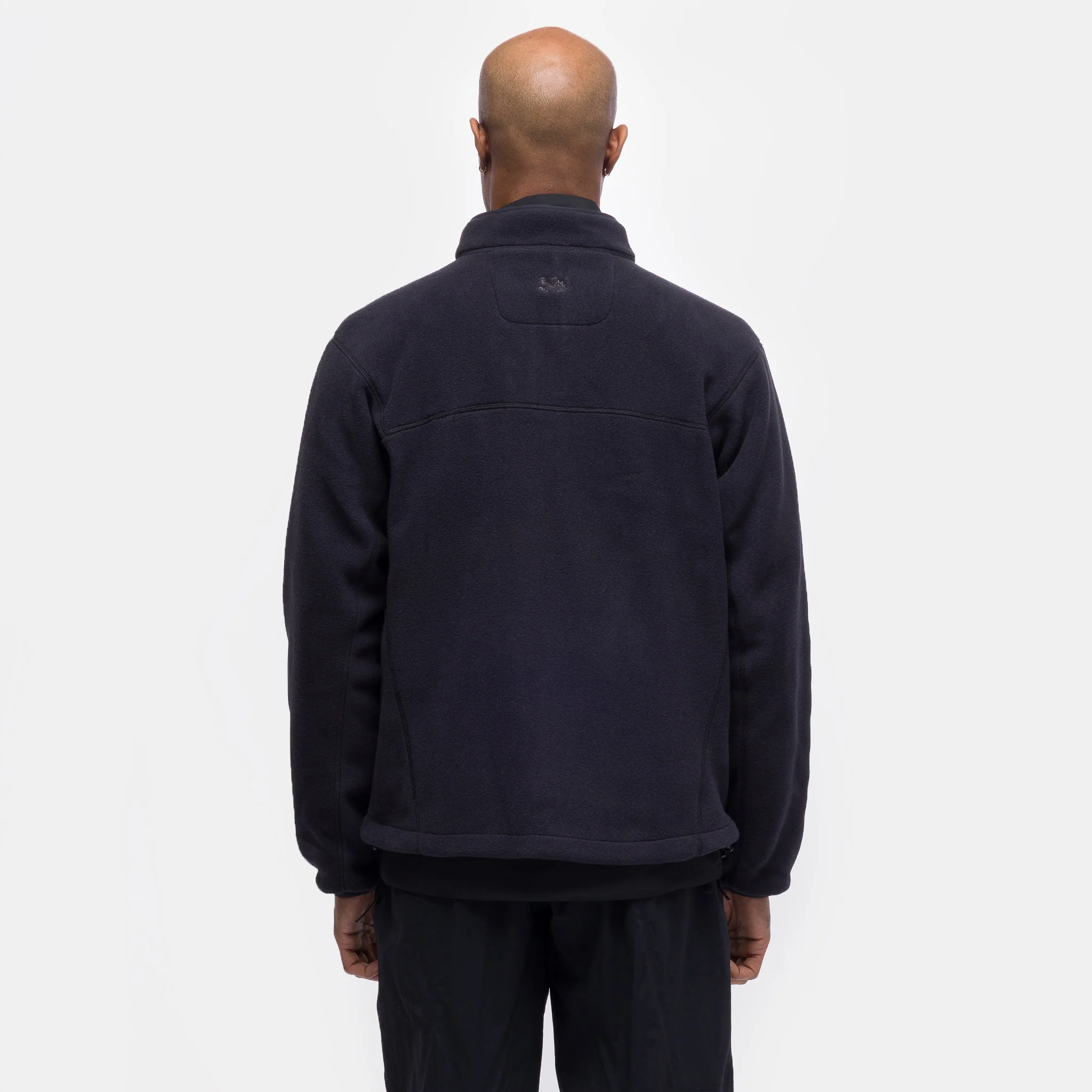 Portal men’s standard fit black fleece jacket. Features recycled Polartec 200, cinch at hem, two way zip, and two hand pockets.