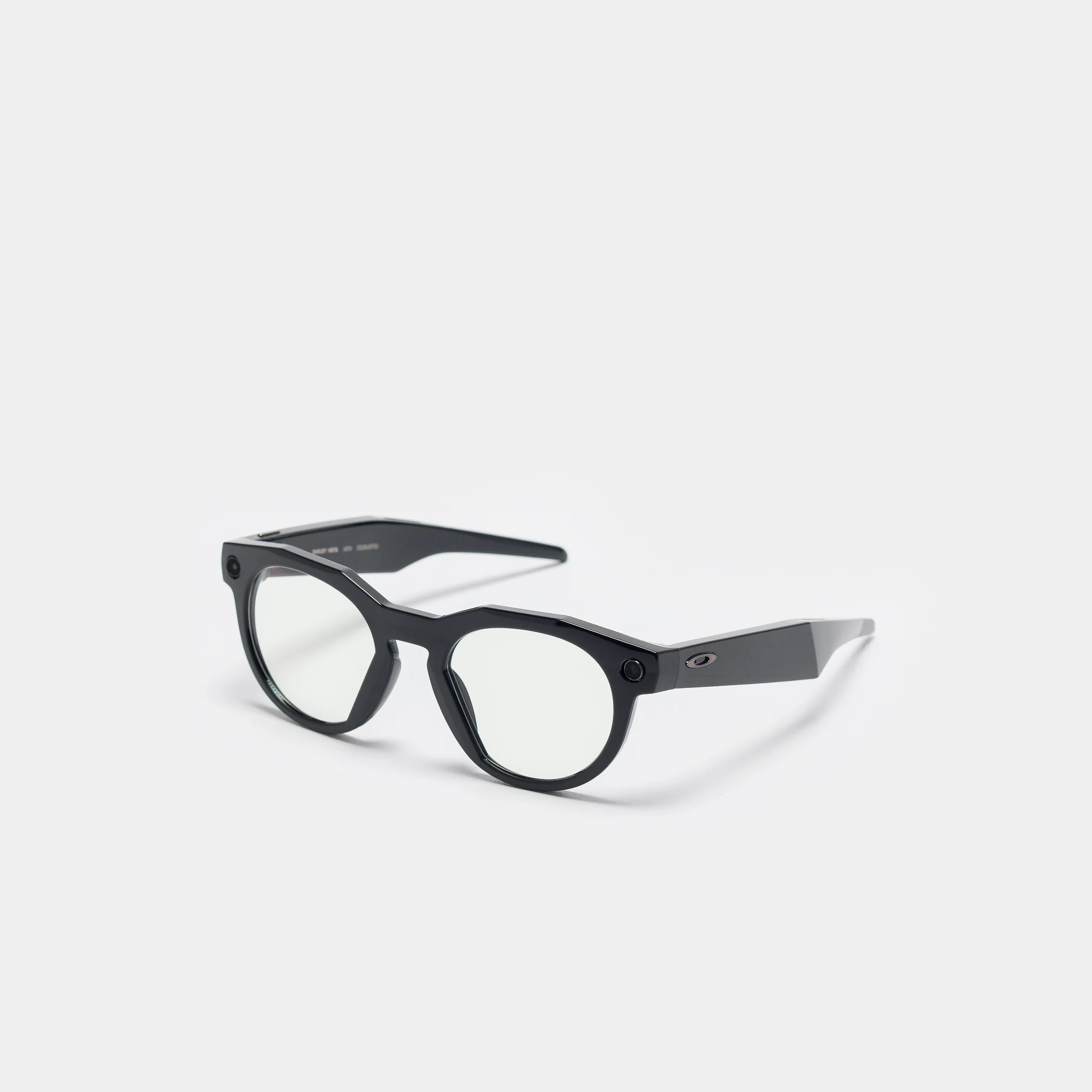 Meta HSTN glasses in black. Feature clear lenses, two open-ear speakers with mic array, and 32GB flash storage