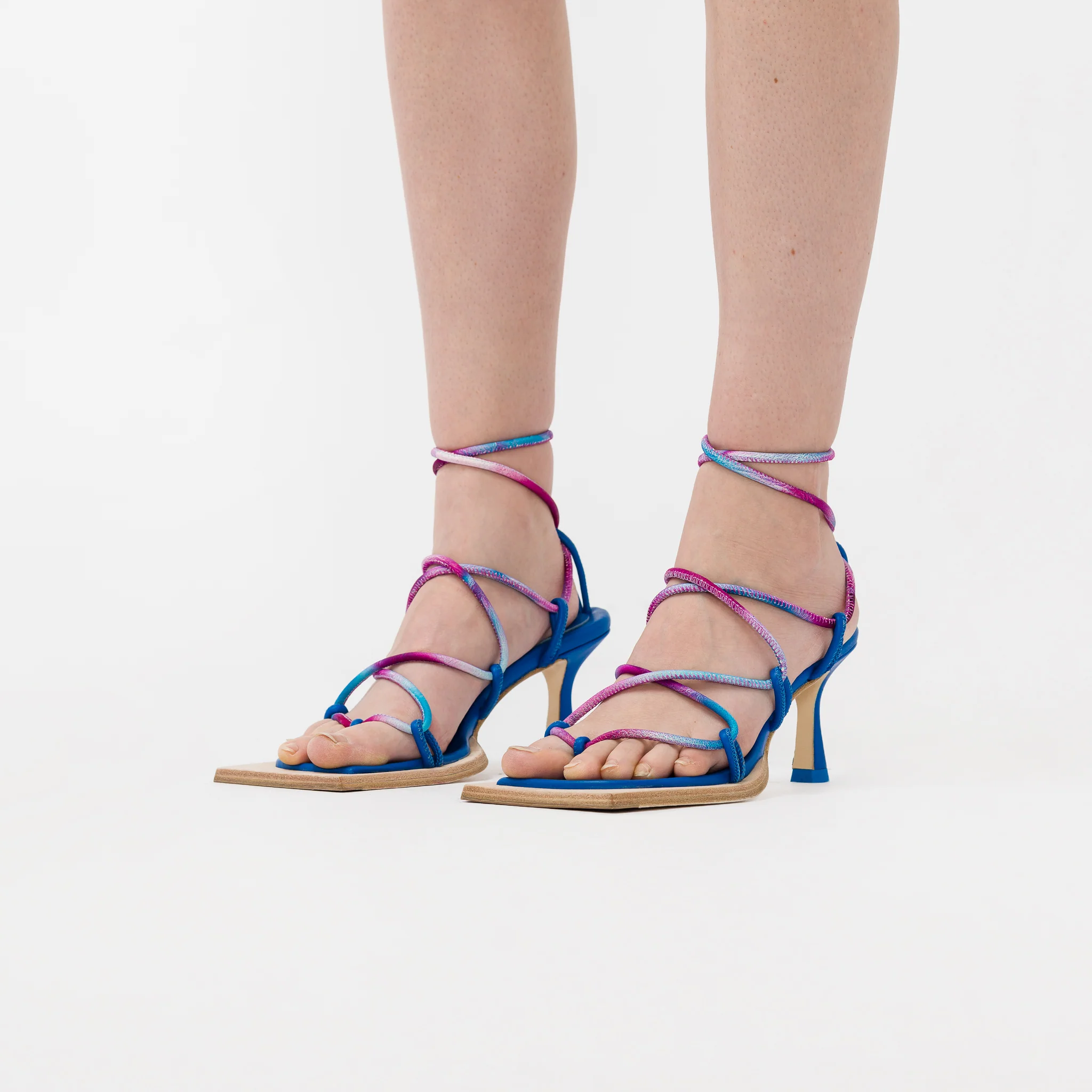 Miista women’s standard fit "Orion" blue and "Violet" purple leather sandal. Features a multicolor laced upper, a square toe, and a stacked leather sole.