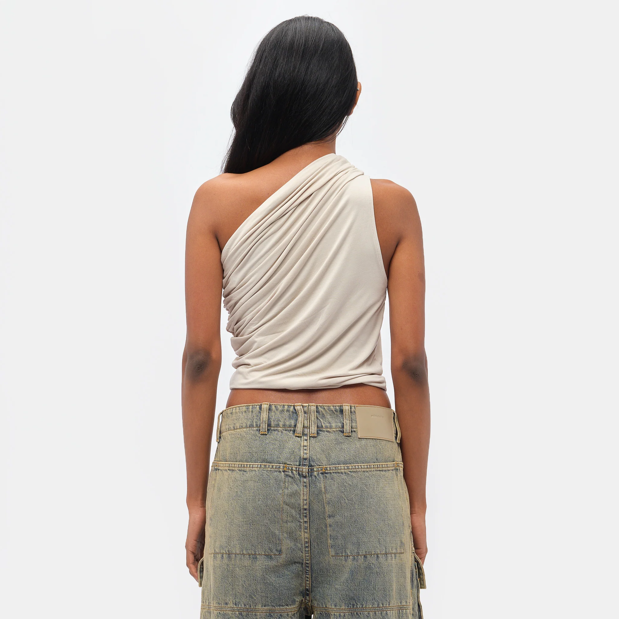 Entire Studios women's viscose grey top. Features a single-shoulder construction and draping and gathering details.