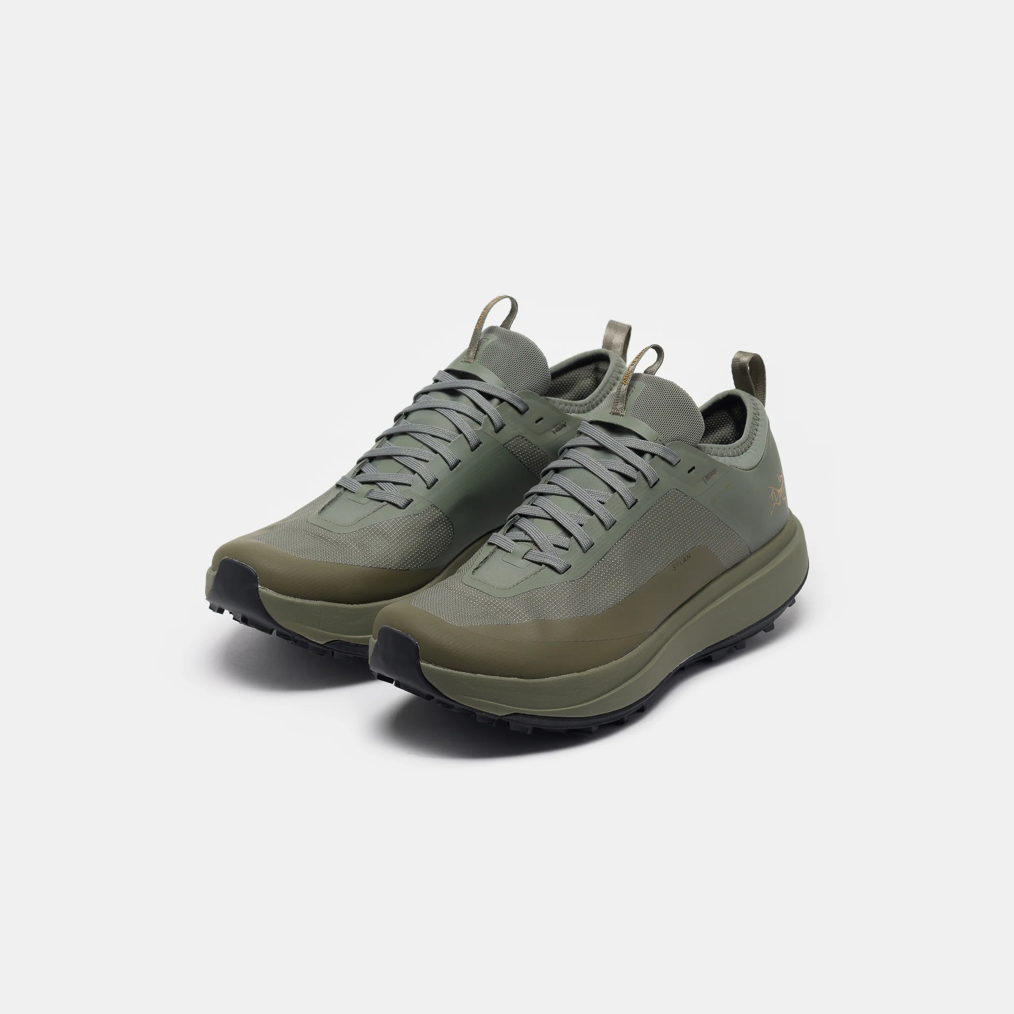 Arc'teryx men’s standard fit "Forage" and "Tatsu" Gore-Tex sneaker features Gore-Tex protection. The midsole’s rocker geometry drives propulsion and is made from InFuse, a light, highly responsive EVA, LITEBASE technology, and an aggressive lug.