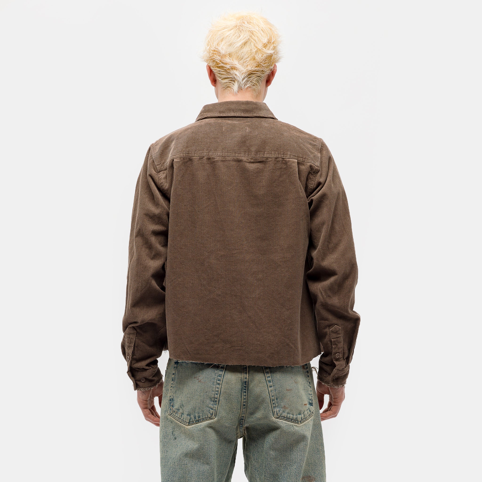 - Distressing on the collar, chest pockets, and sleeves