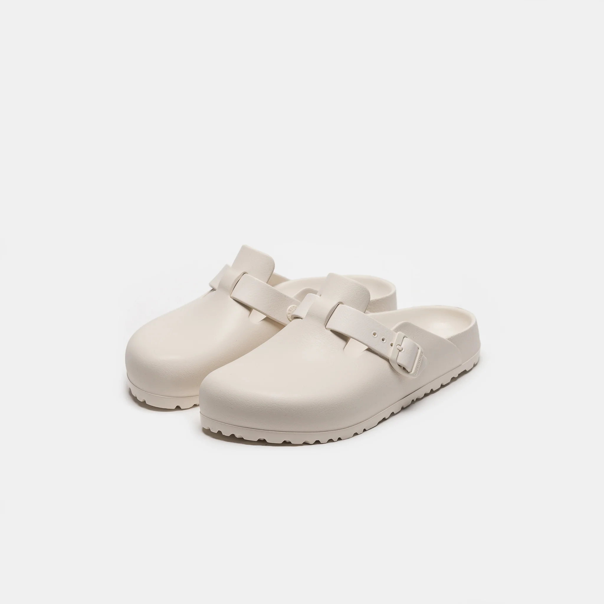 Birkenstock women's standard fit “Eggshell” white EVA Boston. Features a one-piece waterproof, shock-absorbent, molded EVA upper, an anatomically shaped footbed, and adjustable buckle straps