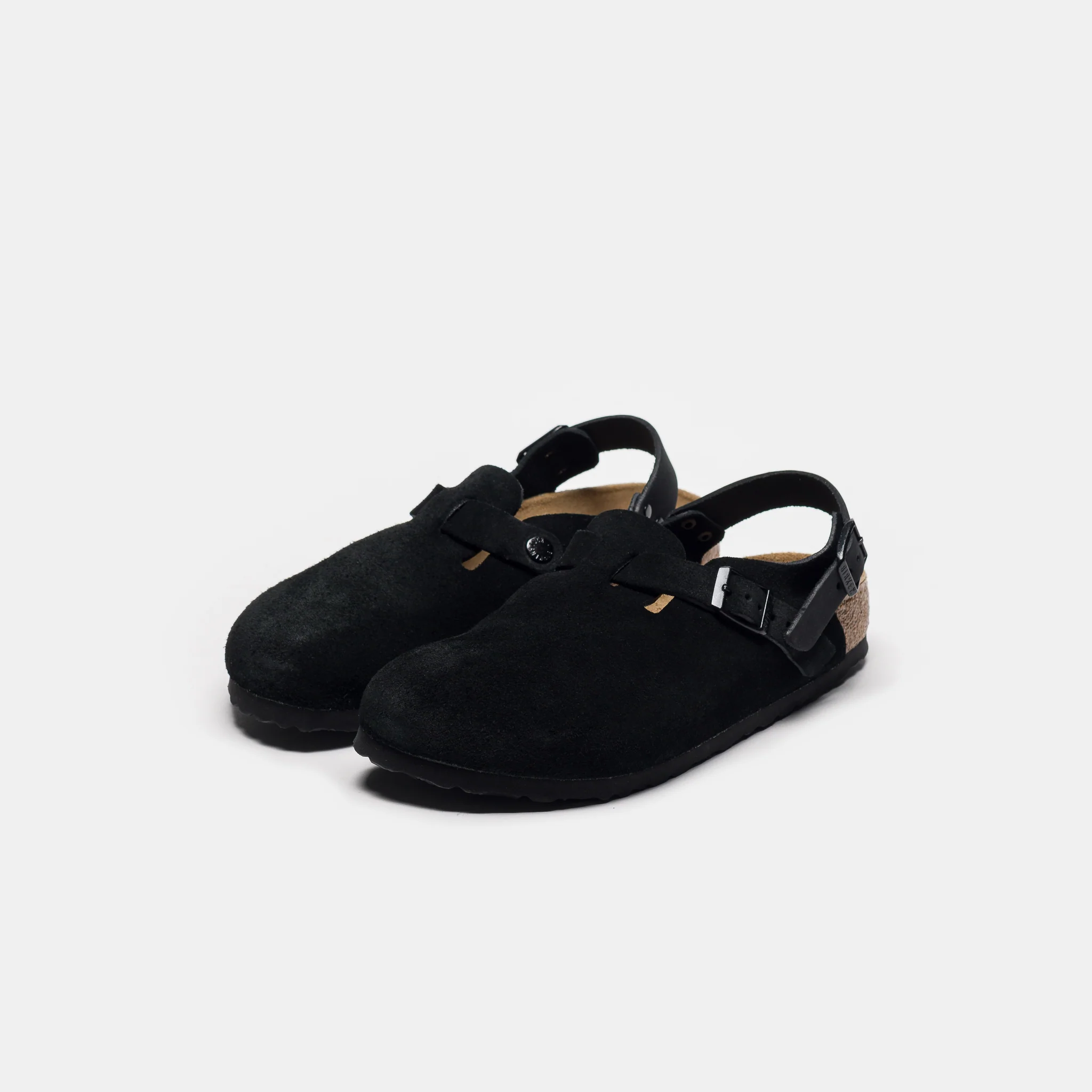 Birkenstock women's standard fit black premium suede mule. Features 2.8 to 3.2 mm leather, adjustable metal pin buckles, an anatomically shaped cork footbed which offers extra support and all-day comfort, and adjustable heel strap, and an Super Grip rubber outsole.